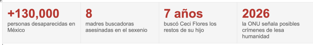 En el vacío que deja el Estado se han instalado, con palas y coordenadas de GPS, las madres buscadoras. Ceci Flores, líder de las Madres Buscadoras de Sonora, encontró recientemente los restos de su hijo Marco Antonio después de siete años de búsqueda que ella misma tuvo que financiar y ejecutar, realizando labores forenses sin formación académica para ello porque nadie más lo hizo. La BBC y Forbes la reconocen como mujer influyente y defensora de la paz; la Presidencia de la República, según sus propias denuncias, la ignora. Esa brecha entre el reconocimiento internacional y el desprecio doméstico es el retrato más fiel de un país que ha tercerizado su deuda moral con las víctimas a la solidaridad de otras víctimas. El precio de esa labor es concreto: ocho madres buscadoras han sido asesinadas en lo que va del sexenio actual.